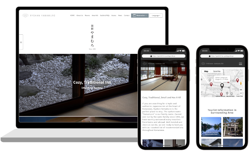 The Quick Guide allows each inn member of Kanazawa Ryokan Hotel Cooperative Association to edit their own tariffs, their restaurant recommendations, sightseeing spots, etc. It incorporates the mapping technology of artex’s Quick navi system.